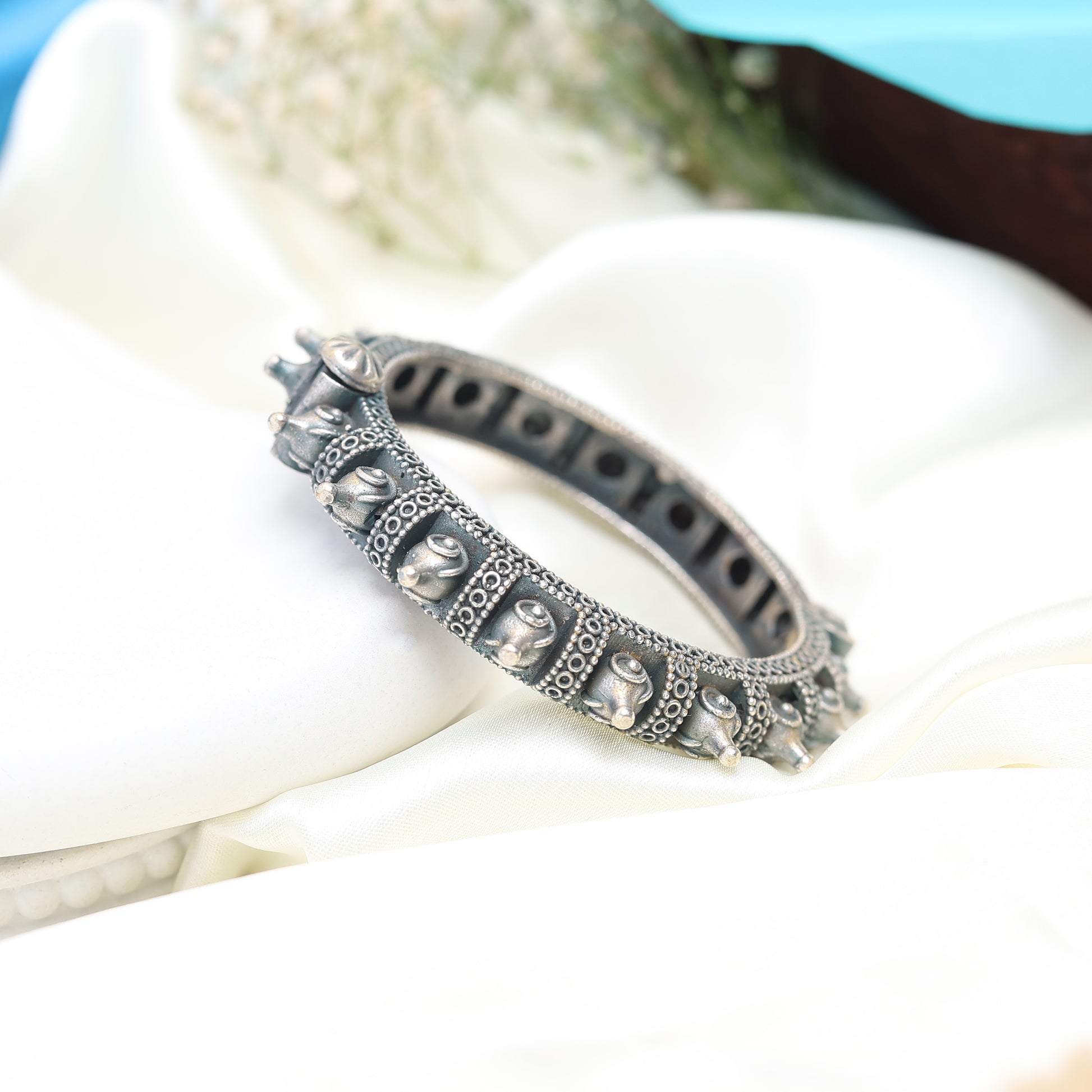 The Silver Lookalike Kada delivers the charm of classic silver with finely crafted brass artistry. Sleek, lightweight, and timeless, it adds an effortless touch of elegance to your everyday style.
